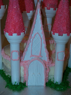 Here's the towers coming together. They are part of the Wilton Romantic Cake kit. They are PLASTIC!! {Cut the work by 75% I'd say. And they look pretty impressive when it's done! }My friend JJ was my partner in crime helper! We melted white chocolate discs and dipped the towers in it and placed it on the cake base to hold it into place. {Worked GREAT!} Then I took the icing and outlined the windows and the door. |